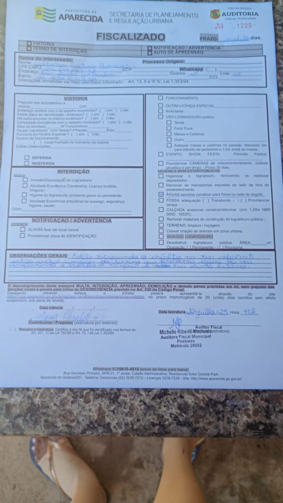 A comerciante conhecida como Dona Betinha, moradora do Jardim Alto Paraíso na rua Gestrudes, em Aparecida de Goiânia, entrou em contato com o Jornal Pacity para expressar sua revolta após ser notificada pela Prefeitura por deixar escorrer água em frente a sua casa. Segundo ela, a notificação foi feita hoje, mesmo com a rua onde mora não tendo rede de esgoto há vários anos.