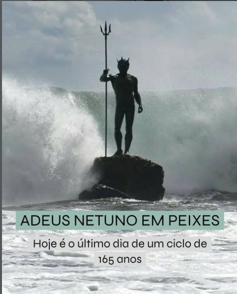O céu chorando. Dissolvendo o que não pode mais permanecer. Lavando a alma do mundo e levando essas águas para o seu reino: o Oceano, útero do mundo, salgando o que é preciso adoçar. Netuno é o próprio regente de Peixes! Imagine! Netuno em Peixes marcou um tempo em que muita gente sentiu profundamente e muita gente deixou de sentir para conseguir sobreviver…e passou a se anestesiar. Hoje algo termina. Um campo psíquico se dissolve. Um modo de existir se encerra. Netuno em Peixes foi sobre atravessar o indefinido. O que não tem nome ou forma. O que não cabe em linguagem. Foi um ciclo de dissolução psíquica coletiva. Um tempo em que a humanidade se perdeu no oceano das imagens, das projeções, das anestesias, das ilusões e das identidades líquidas. Foi a era da dissociação como adaptação.